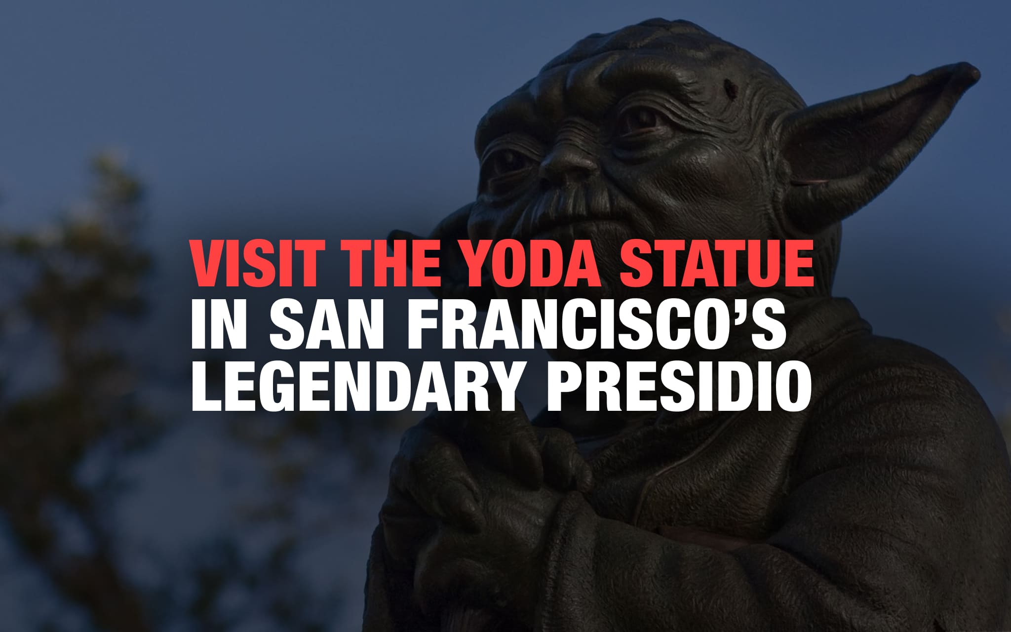 The Presidio itself is a beautiful and historically rich area of SF, filled with walking trails, green spaces, and scenic overlooks. Getting to the Yoda statue is straightforward — public transit, ride-shares, and parking options all make this location easy to reach from any point in SF. Once inside the Presidio, follow clear signs toward the Letterman campus. The statue will greet you near a glass-walled lobby that subtly displays props and memorabilia through its windows.